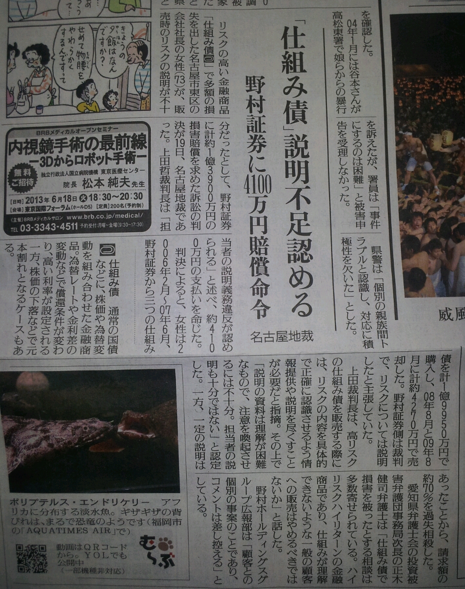 - 読売新聞朝刊で、野村證券の仕組み債判決に関するコメント掲載(平成25年4月20日)