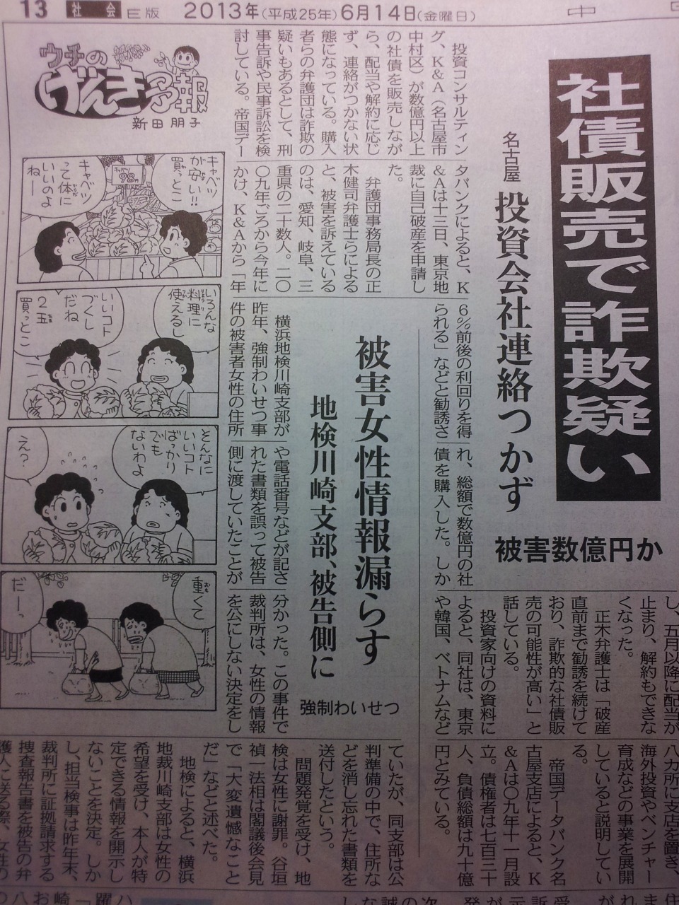 - 中日新聞夕刊で、K&A投資被害弁護団事務局長としてのコメント掲載(平成25年6月14日)