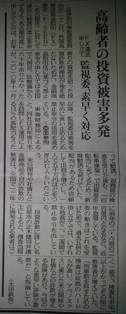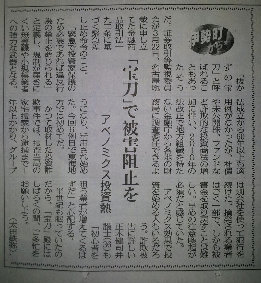 - 中日新聞夕刊のコラムに、投資被害に関するコメント掲載(平成25年4月1日)
