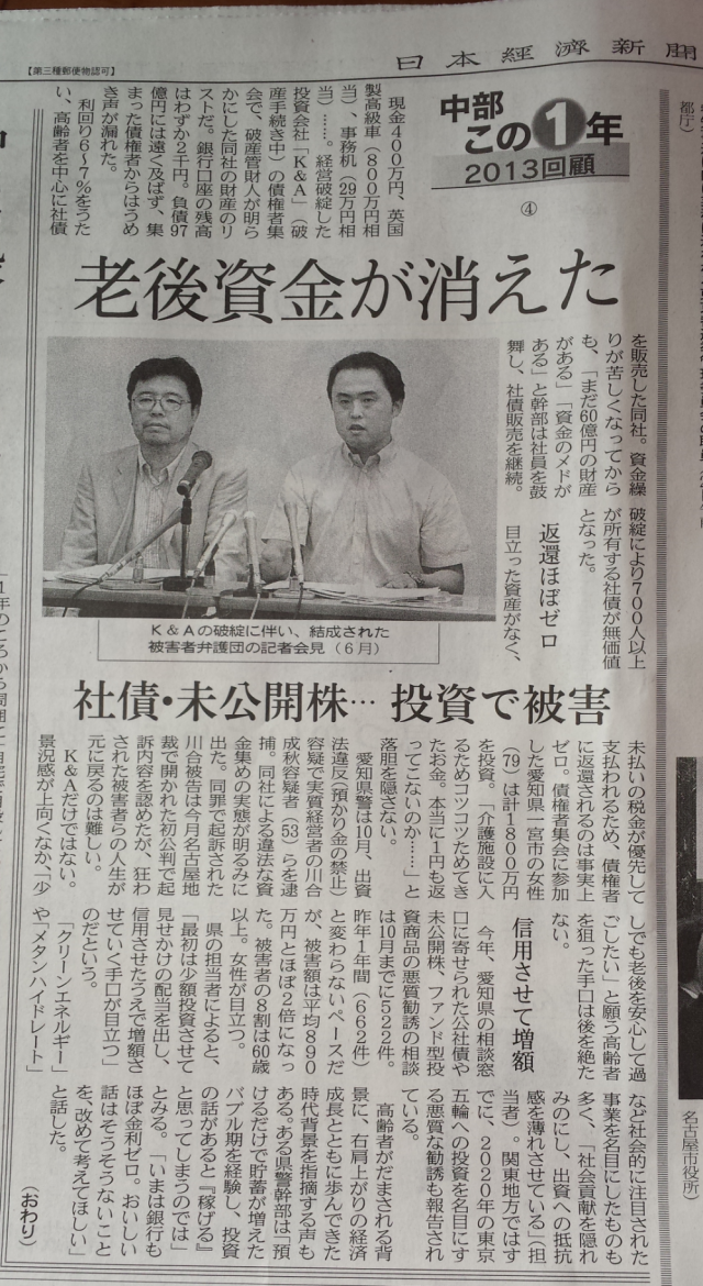 - 日本経済新聞夕刊の特集(「中部この1年 2013回顧」)で、K&A投資被害に関する記事掲載(平成25年12月27日)